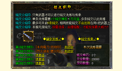 每个武器最多可刻印(5)条铭文,同一种技能铭文不会出现两个。例如,烈火剑法[燃烧印]与烈火剑法[神光印]不会出现在一起!